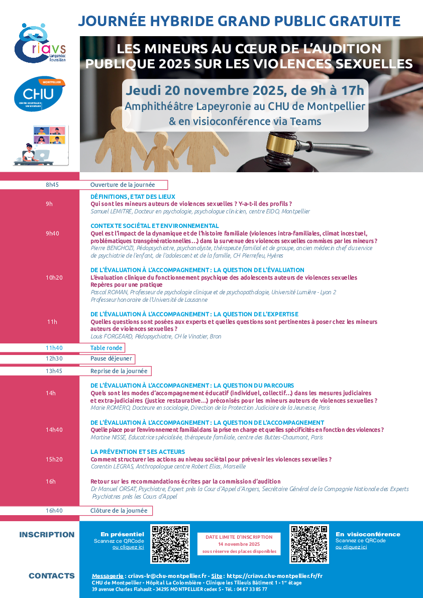 Le CRIAVS-LR, du CHU de Montpellier, a choisi de revenir sur cette audition publique à l'occasion d'une de ses journées hybride gratuite grand public bi-annuelle : les mineurs au cœur de l'audition publique 2025 sur les violences sexuelles. Plusieurs experts reviendront sur la question qui leur avait posée lors de l’audition.