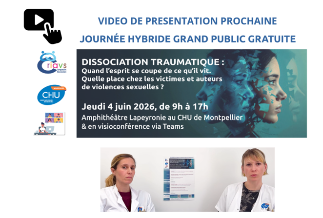 Rendez-vous sur le site Internet du CRIAVS-LR pour vous inscrire dès à présent : Journée hybride gratuite grand public "Dissociation traumatique : quand l’esprit se coupe de ce qu’il vit. Quelle place chez les victimes et auteurs de violences sexuelles ?" - CRIAVS - CHU de Montpellier